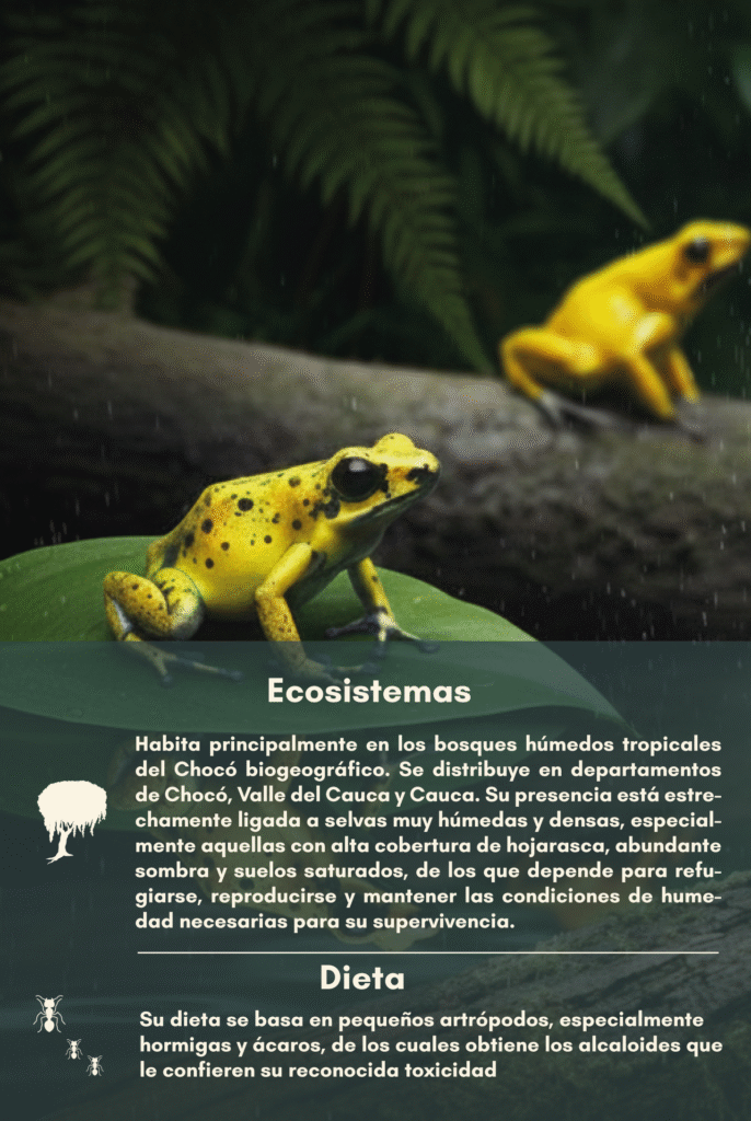a Rana Dardo Dorada (Phyllobates terribilis), es una especie endémica del Pacífico colombiano, que habita principalmente entre los 50 y 200 m s. n. m. en los bosques húmedos tropicales del Chocó biogeográfico. Se distribuye en zonas como las cuencas bajas de los ríos Saija, San Juan y Atrato, en sectores de los departamentos de Chocó, Valle del Cauca y Cauca. Su presencia está estrechamente ligada a selvas muy húmedas y densas, especialmente aquellas con alta cobertura de hojarasca, abundante sombra y suelos saturados, de los que depende para refugiarse, reproducirse y mantener las condiciones de humedad necesarias para su supervivencia.